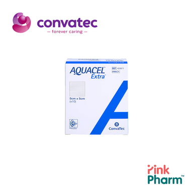 413566 Convatec AQUACEL AG+ EXTRA อควาเซลเอจีพลัสเอ็กซ์ตร้า แผ่นปิดแผลไฮโดรไฟเบอร์มีซิลเวอร์และเส้นใยเสริมความแข็งแรง ขนาด 5X5CM จำนวน 10 ชิ้น/กล่อง